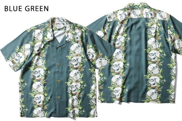 - レーヨンアロハシャツ「骸骨」 ◆HOUSTON ブルーグリーン Mサイズ 41201 ヒューストン 和柄 和風 ハワイアン 髑髏 ドクロ