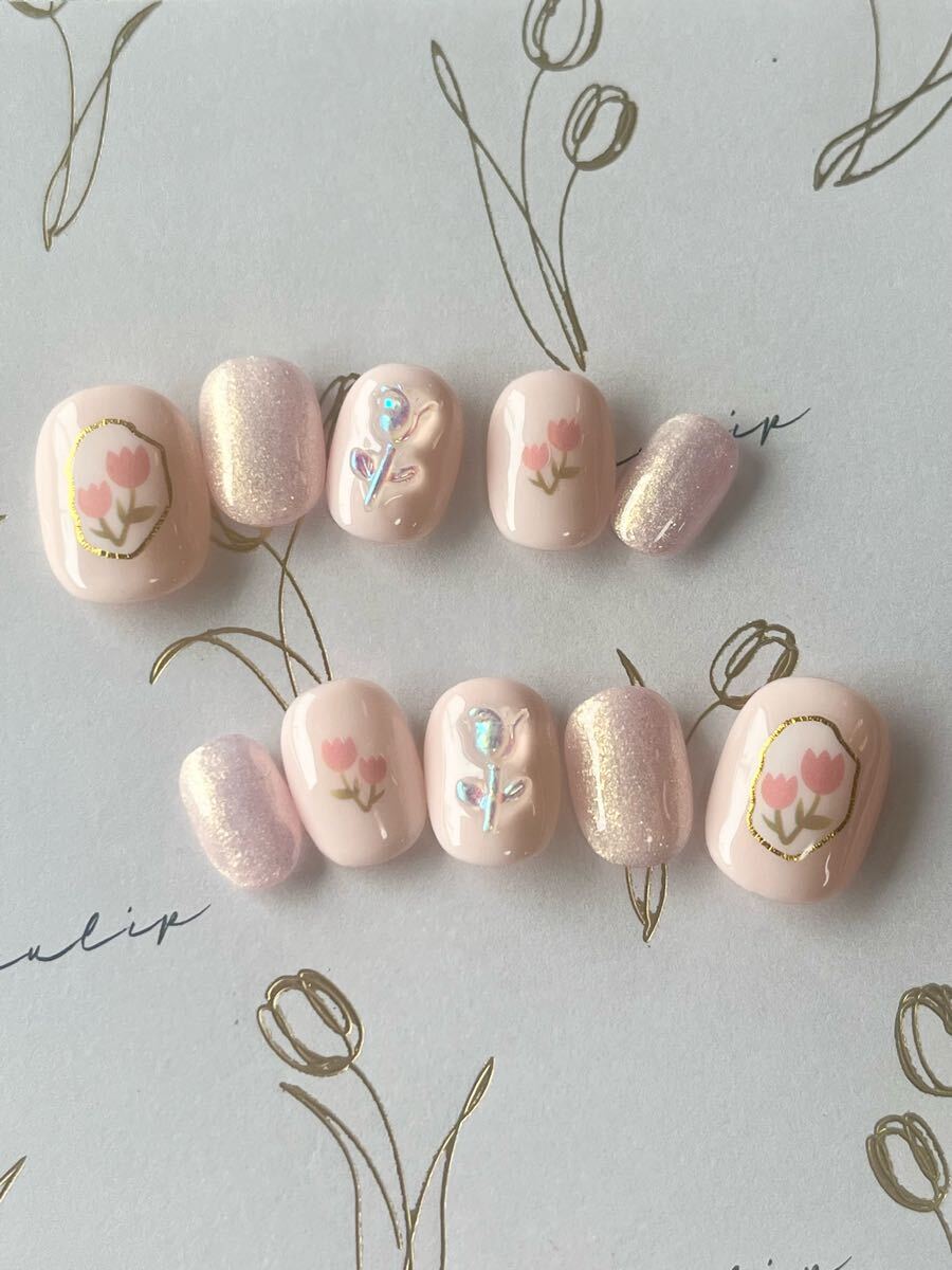 - ハンドメイド ネイルチップ ベリーショートオーバル ピンク チューリップ