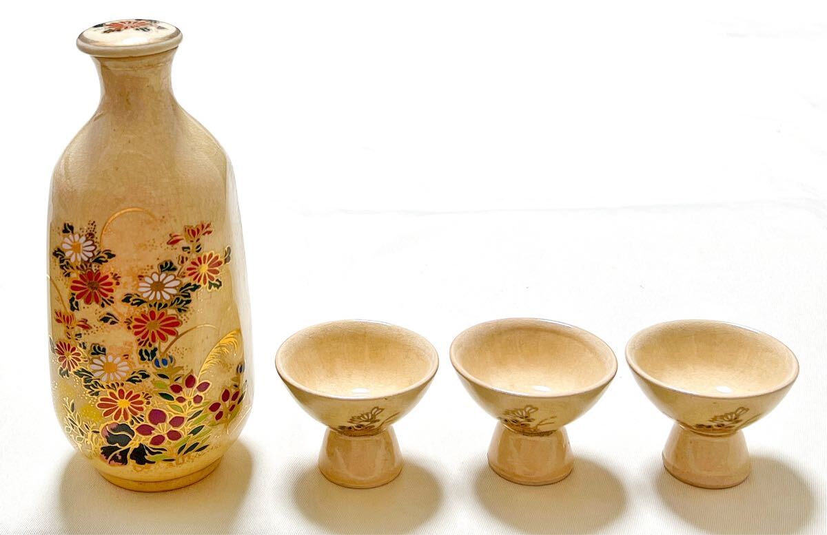 - 南国工芸 薩摩焼 金彩色絵菊紋 徳利1本&盃3個 片酒器セット