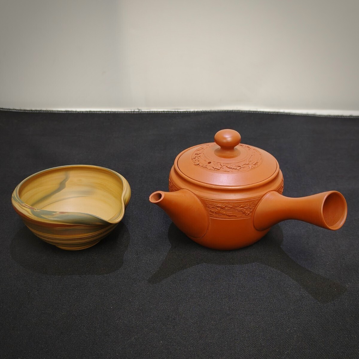 - 朱泥 急須 練込み 湯冷 2点セット 香峰 朱泥急須 靖仙 練込み湯冷 常滑焼 茶道具 在銘 茶器 茶注 煎茶道具 横手急須 (06017H