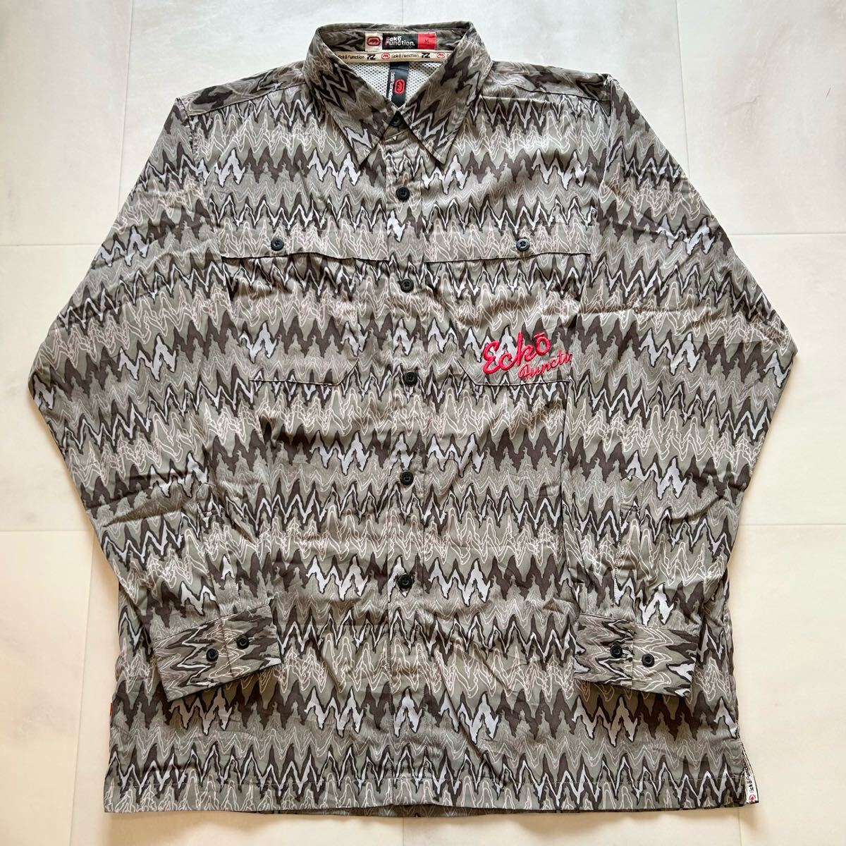 - 90s Ecko Function エコー 総柄 柄シャツ ロゴ 刺繍 レトロ アート ビンテージ 長袖シャツ ポリエステル100%