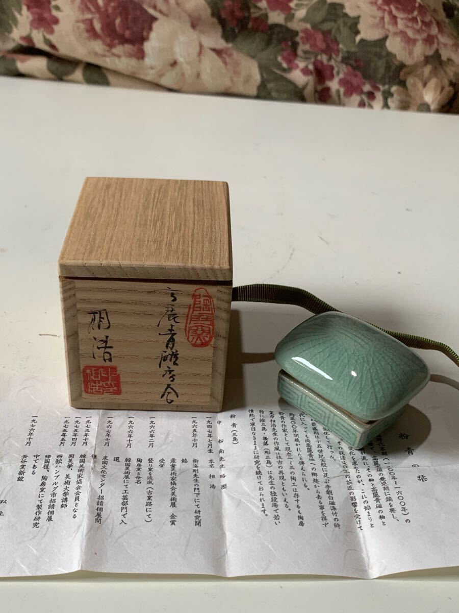 - 韓国人間国宝 申相浩 青磁 香合 共箱