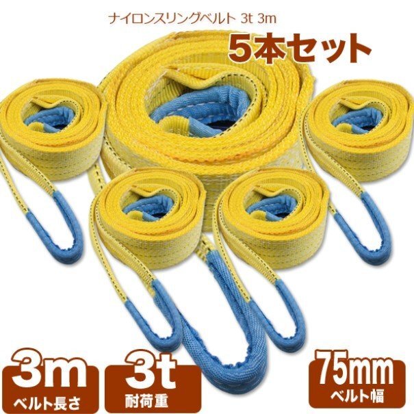 - 【送料無料】スリング ベルト 運搬用スリング 3m 耐荷重3t 5本セット 荷揚げ 吊り上げ 吊り下げ 玉掛け ナイロンスリング グリーン