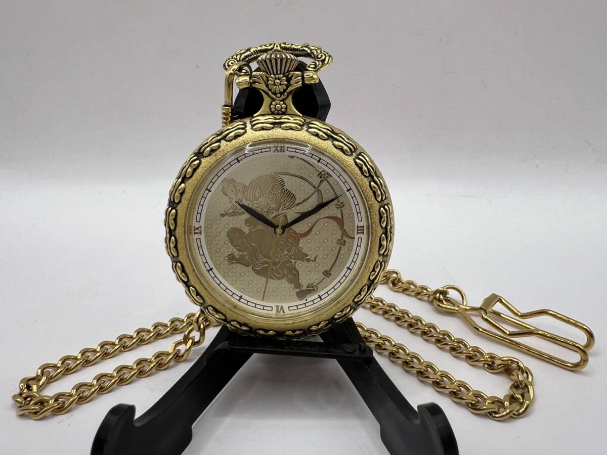 - B) 風神雷神 懐中時計 ゴールド クォーツ ケース 4.4cm 動作未確認 D79i