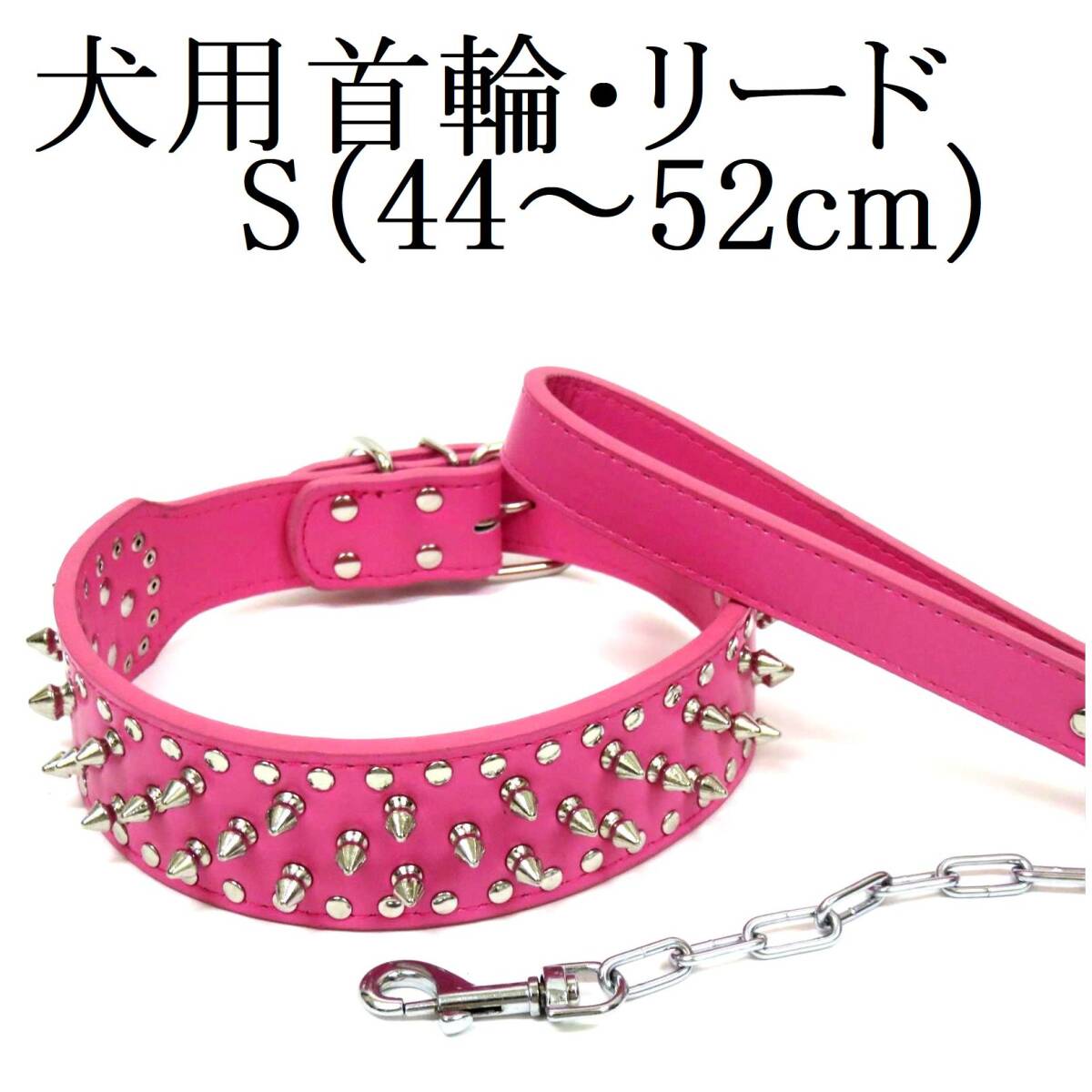 - 首輪 チェーンリード セット S ピンク 大型犬 首回り44~52cm前後 幅5cm リード120cm スタッズ首輪 PUレザー トゲトゲ カラー ペット 散歩