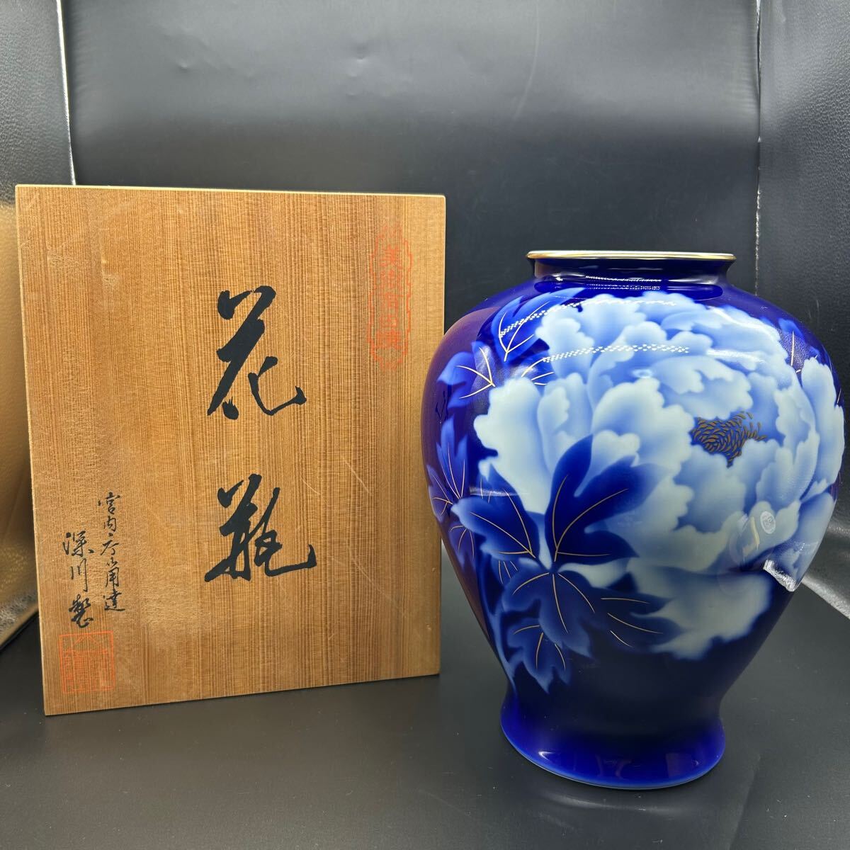 - 深川製磁 ルリ牡丹 瑠璃牡丹 F型9号花生 花瓶 花器 花入 壺 インテリア 置物 ヒ4