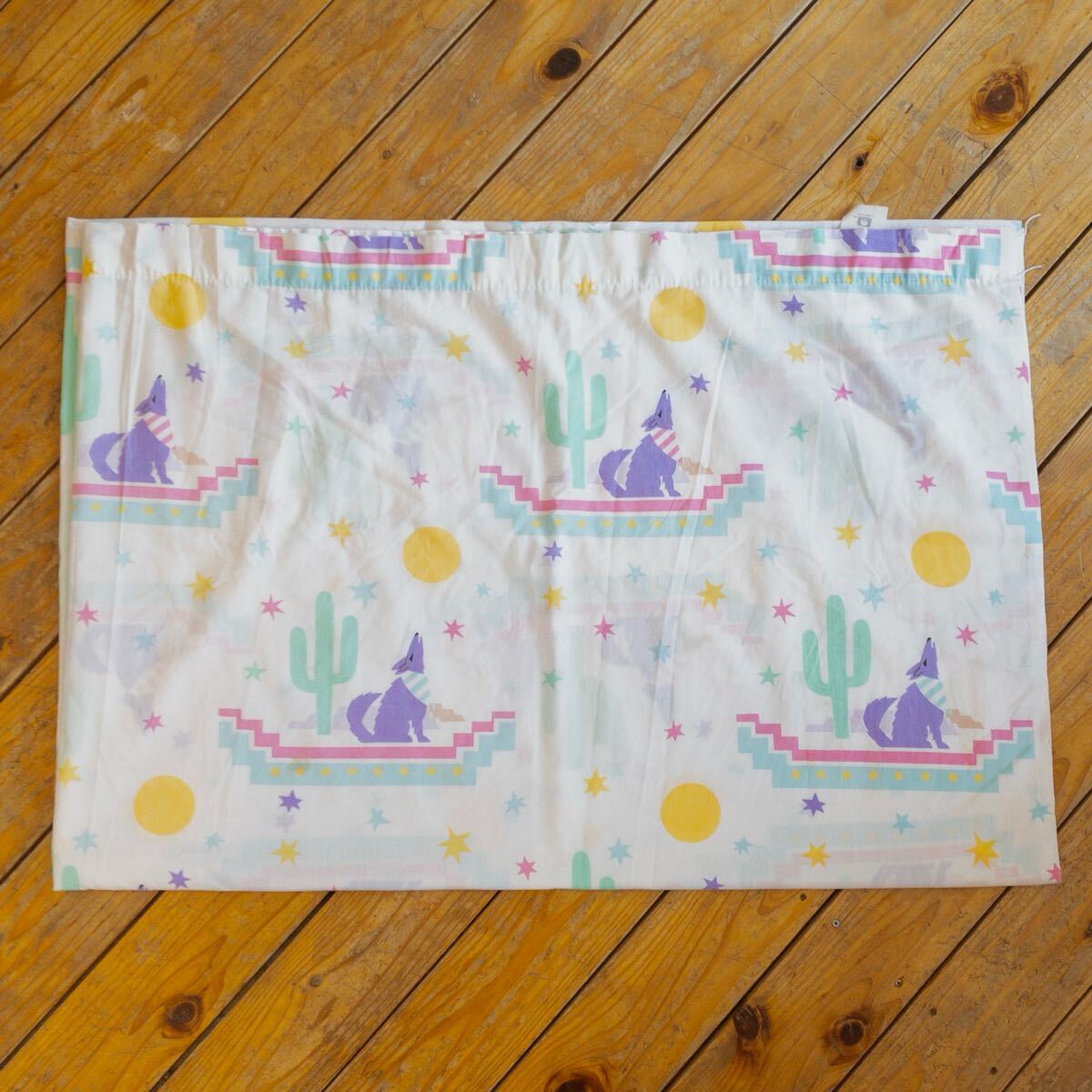 - USAヴィンテージ ベッドシーツ 狐 キツネ リメイク生地 ムーン 月 サボテン 星 スター 総柄 素材 フラットシーツ アメリカ仕入 B2800