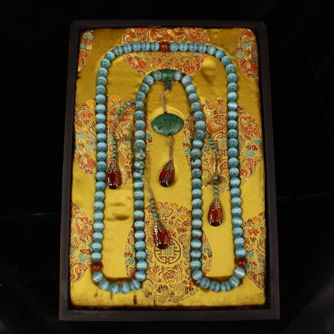 - 蔵友旧蔵出 猫眼石製 細密彫 藍猫眼石 朝珠 箱付 希少珍品 貴重品 置物 古賞物 中国古玩 中国古美術品