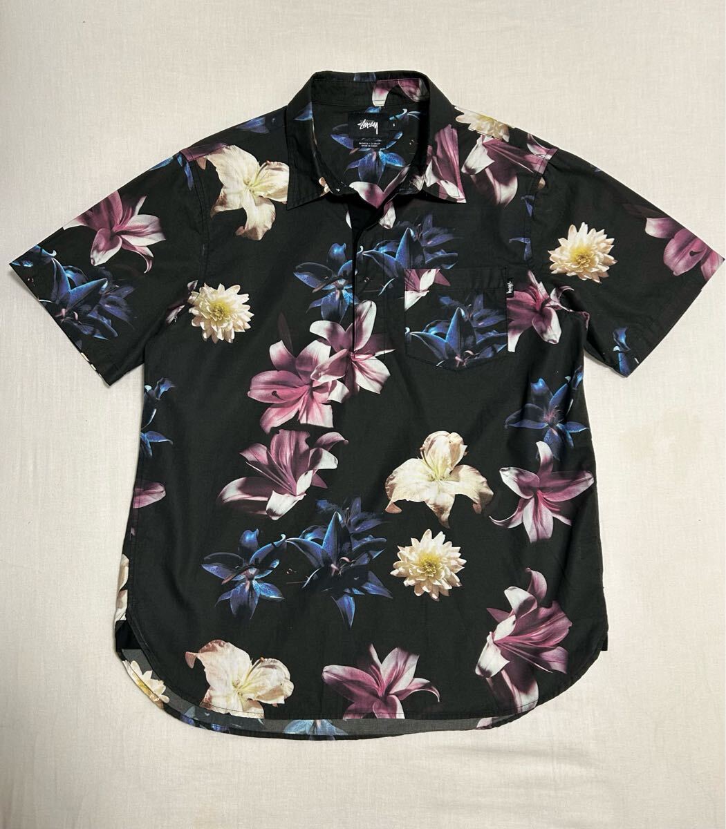 > STUSSY ステューシー フラワープリント 花柄 プルオーバー S/S シャツ 黒 ブラック S アロハ ボタニカル 半袖シャツ