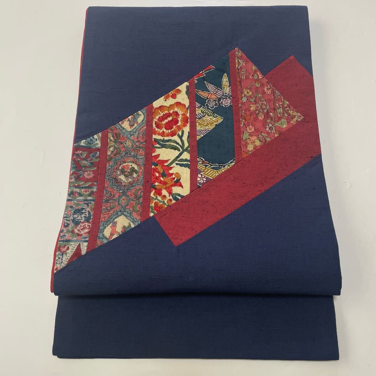 > #H228 美品 開き名古屋帯 洗える帯 木綿 紬 パッチワーク調 紅型 青々庵謹製 藍色 お洒落 和装 和服【wellriver】