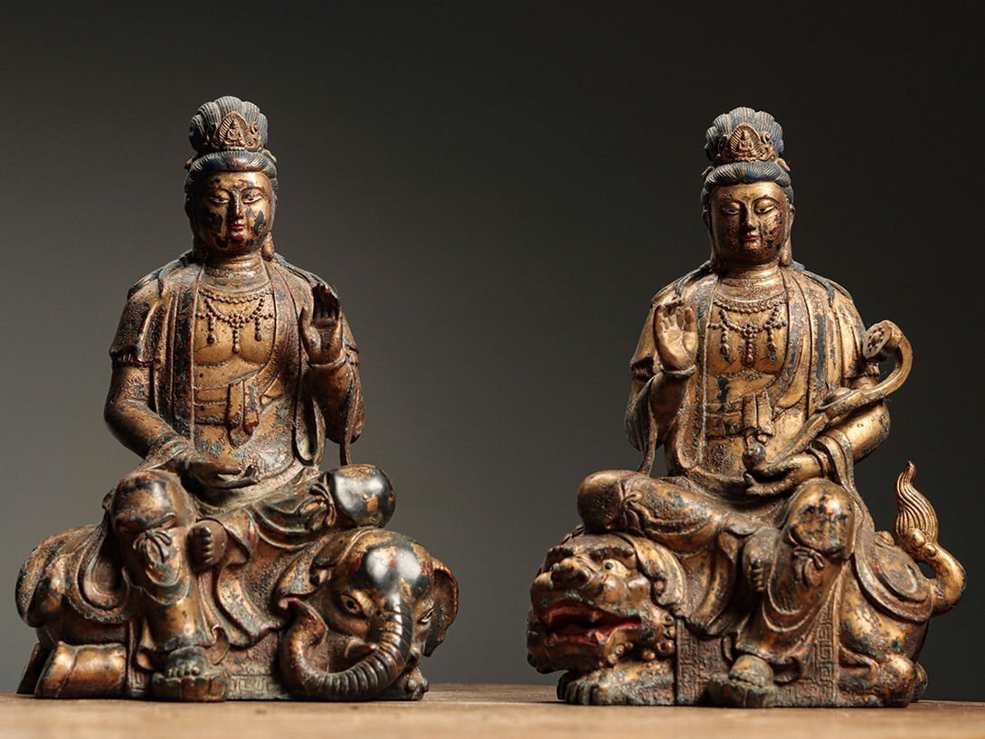 - ▼渡鶴羽▼A9282清時代 銅塗金 文殊 普賢菩薩 細工彫刻★仏教古美術★仏像★細密細工★廃寺旧蔵★廃寺買出品