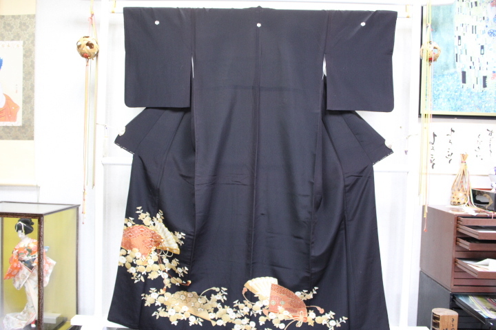 - きもの今昔8577 合繊黒留袖紋付 ポリエステル比翼付き 扇に金駒刺繍房紐刺繍と菊の花柄 身丈161cm