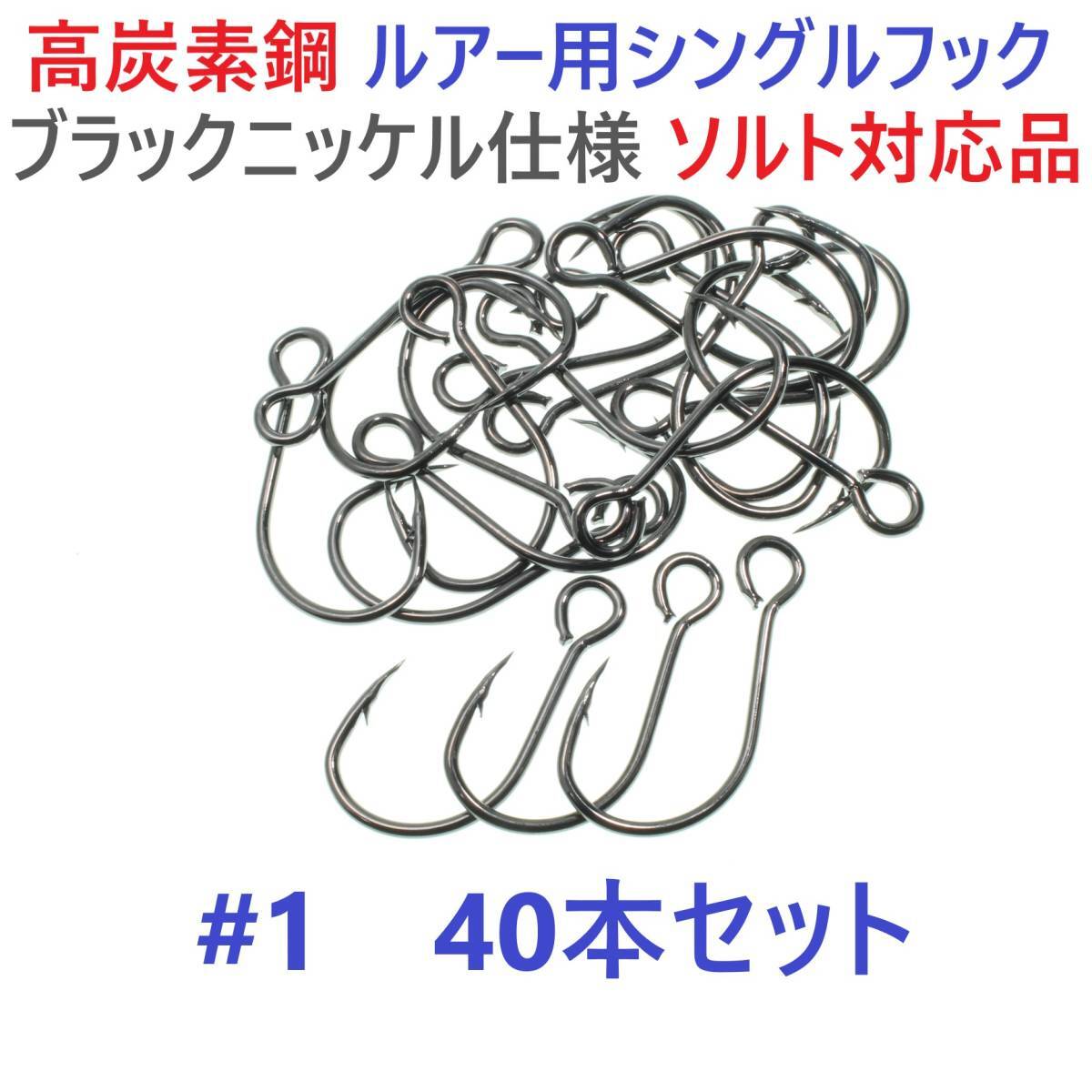 > 【送料150円】高炭素鋼ルアー用 シングルフック #1 40本セット ソルト対応 ブラックニッケルメッキ 縦アイ ビッグアイ仕様