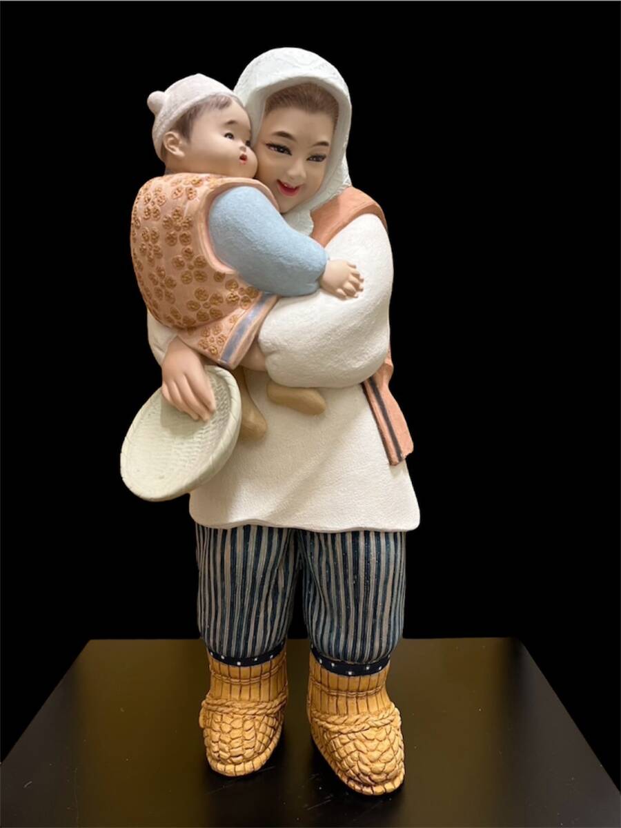- B) 高級 博多人形 作家サイン入り 残雪 母と子 台座付き C14i