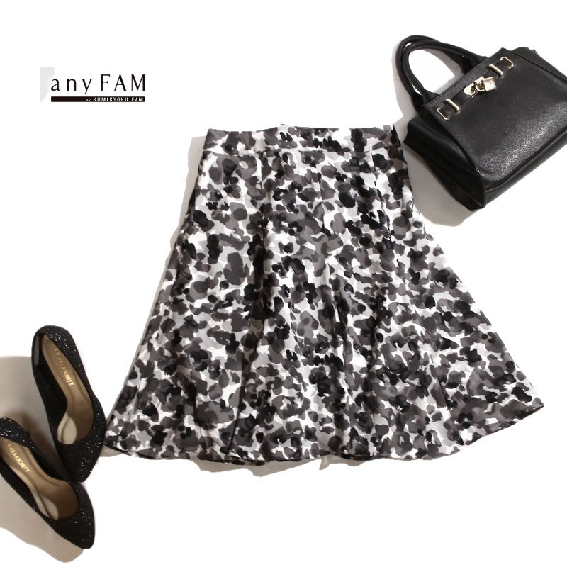 > 美品 エニィファム any FAM 組曲 株)オンワード樫山 春 夏 薄手 涼し気 軽やか ぼかし 柄 プリント シフォン フレアスカート 3 グレー 黒 L