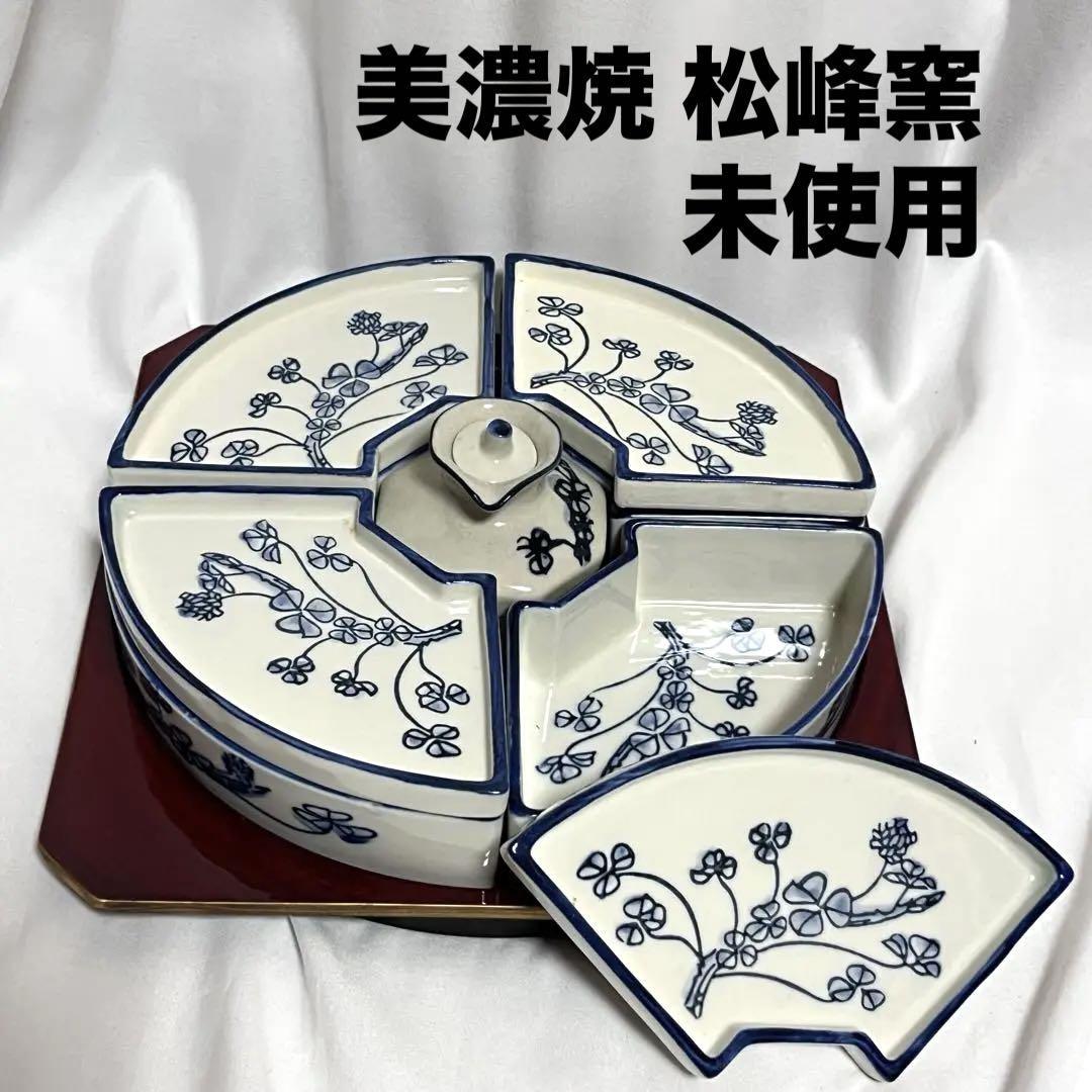 - 未使用 レトロ オードブル皿セット 蓋 ソースポット お盆付 美濃焼 松峰窯 古代草花