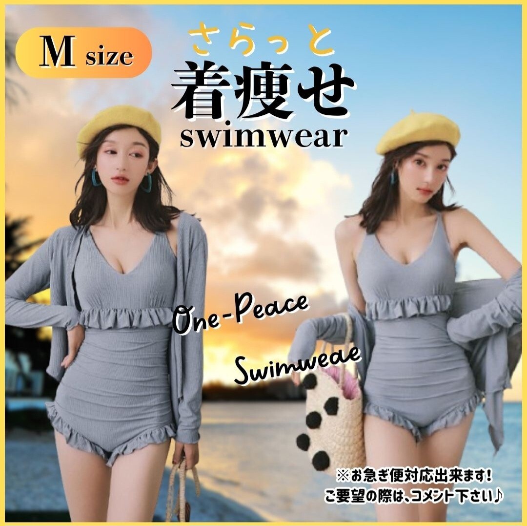 - M 羽織り セット ワンピース ビキニ フリル カーディガン 水着 レース グレー ビーチ モノキニ セクシー エロカワ プール