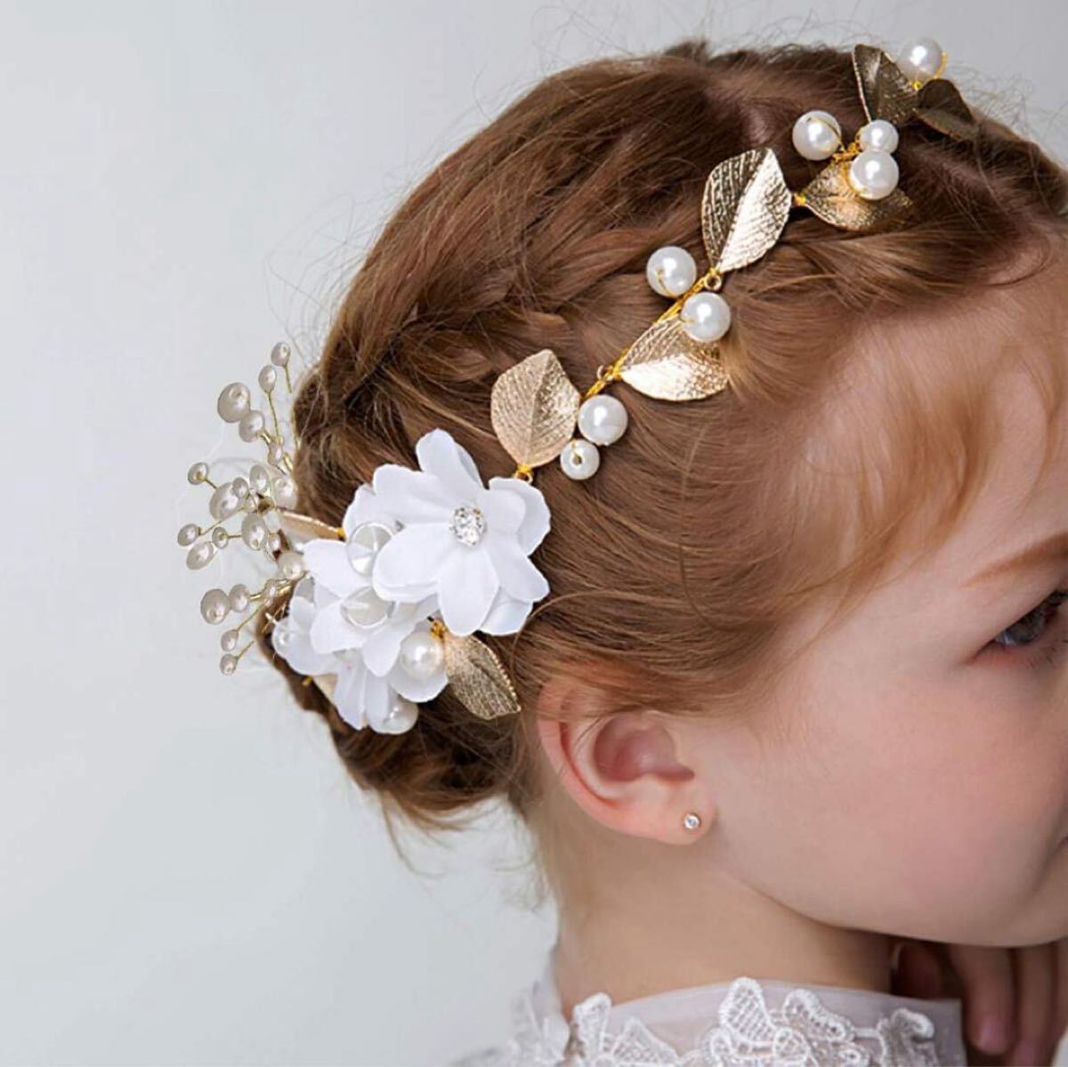 - ヘッドドレス ゴールド 金葉 花 ホワイト パール キッズ 発表会フォーマル