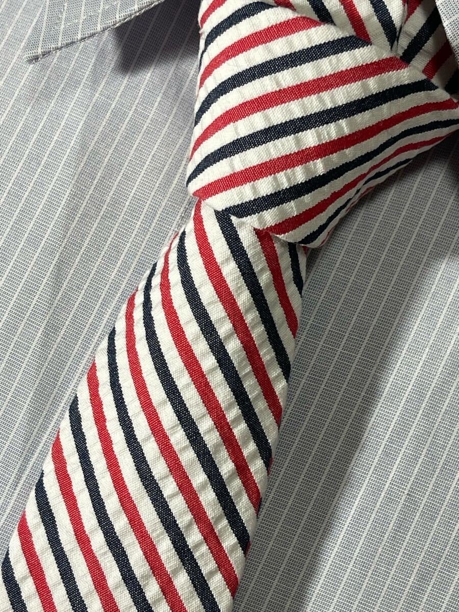 - ほぼ未使用 ″THOM BROWNE″ トムブラウン ストライプ トリコロール シアサッカー生地 ナロータイ ブランドネクタイ 506046