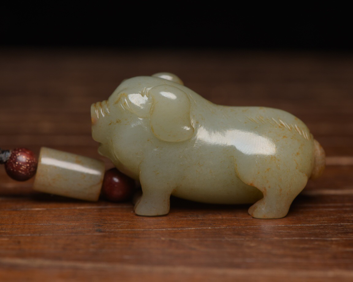 - 『館蔵珍品 和田玉製 細密彫 玉豬 置物 賞物』稀少珍蔵品 古賞物 貴重物品 収蔵品 中国古美術 時代物 古董品