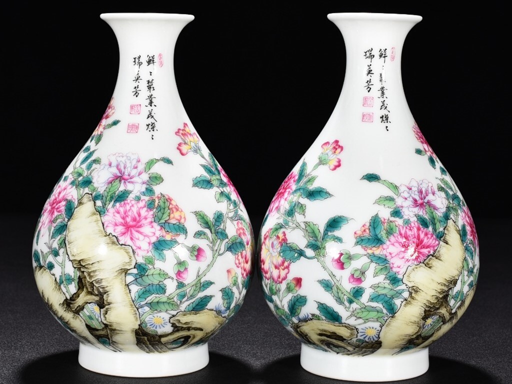 - TD117■中国古玩 唐物 大明乾隆年制款 琺瑯彩花卉紋玉壺春瓶 時代物 極上品■高さ16.5cm・直径10.5cm■