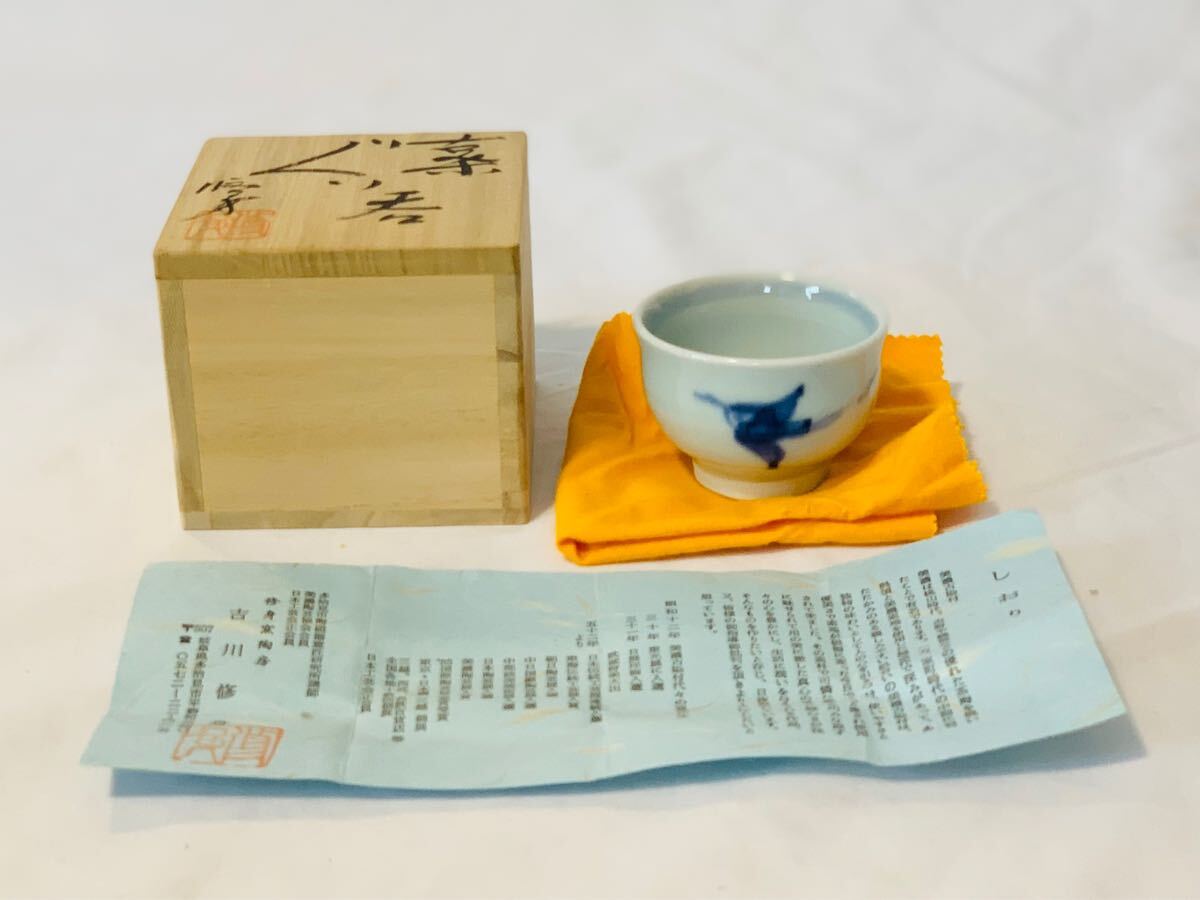 > 吉川修身 古染 鳥 ぐい呑 古染付 修身窯陶房 酒杯 盃 酒器 ぐい呑み 陶歴 書付 栞 共箱 共布 未使用 酒盃