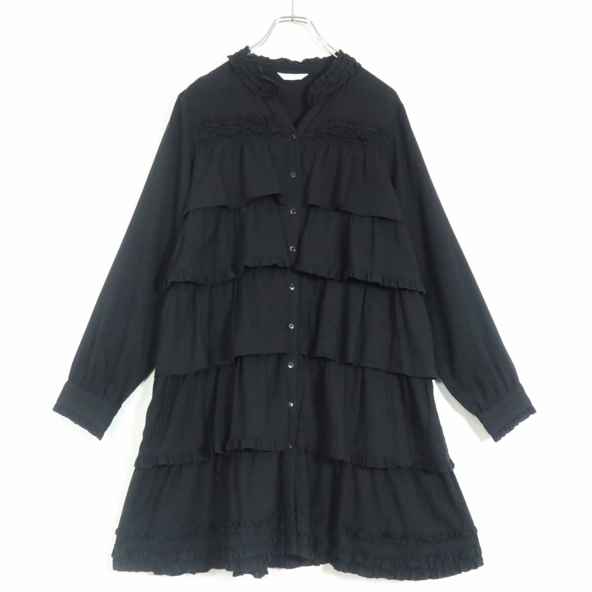 > 【美品】ピンクハウス★かぶせ段々フリルのブラウス チュニック 黒系 前開き カットソー素材♪無地 z13907