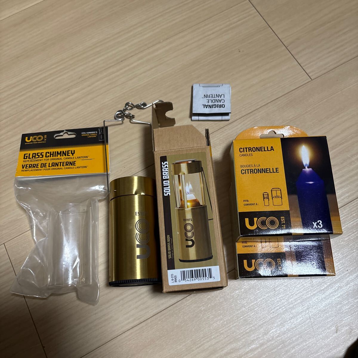 - UCO 4点セット ソリッドブラスランタン 替えグラス シトロエン 蝋燭二箱(アロマ、虫除け効果あり)新品