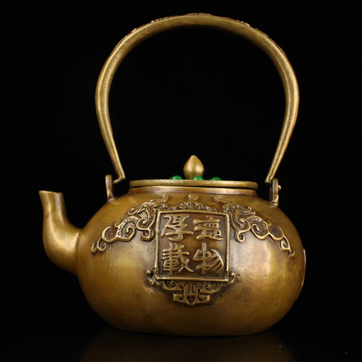 - 蔵友旧蔵出 銅製 寶石嵌 厚德載物 提梁茶壺 希少珍品 貴重品 置物 古賞物 中国古玩 中国古美術品