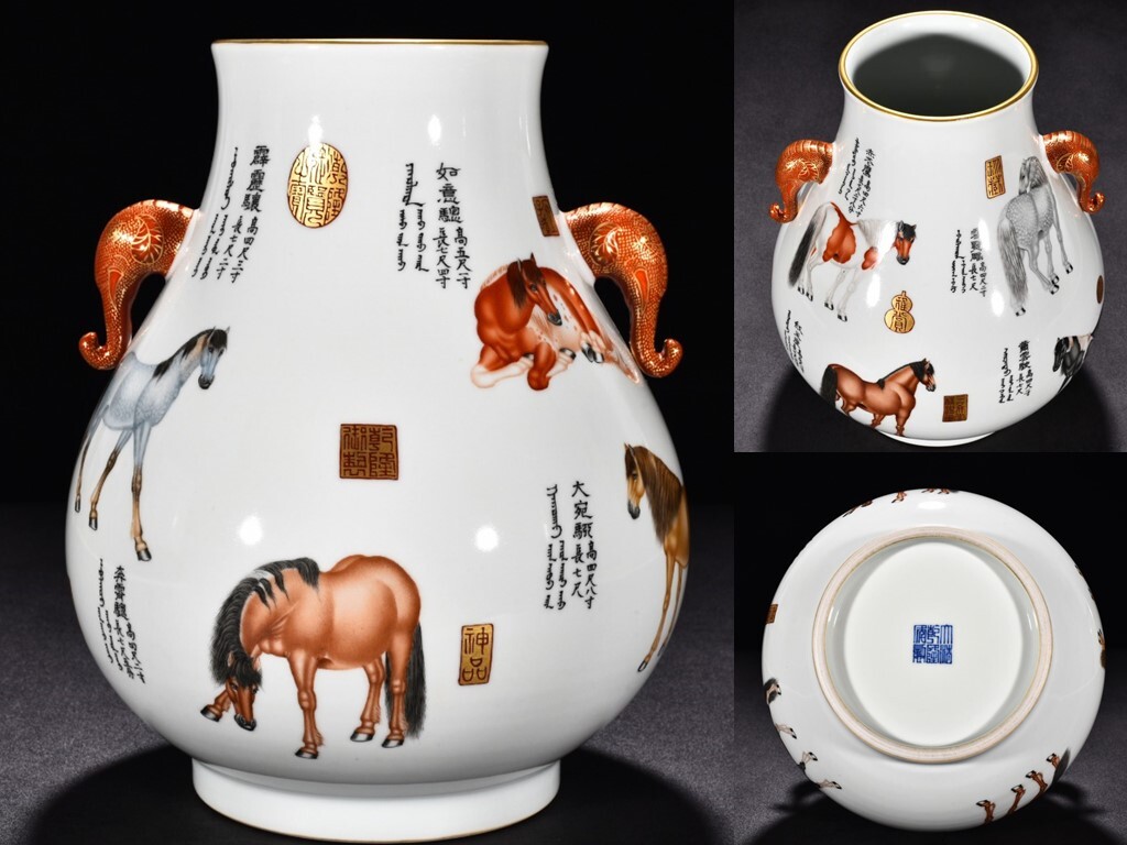 - TB243■中国古玩 唐物 清乾隆 琺瑯彩 朗世寧絵八駿象耳尊瓶極上品■高さ26cm・直径21cm■
