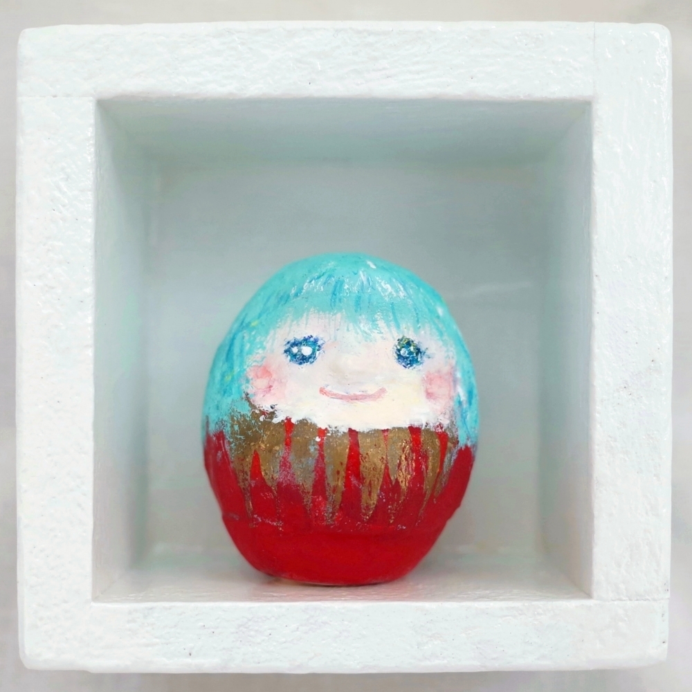 - 内野隆文 だるま姫 オブジェ 立体作品 彫刻 古いだるま・一合枡・アクリル絵の具 可愛い 縁起物 昭和ヴィンテージ 古道具