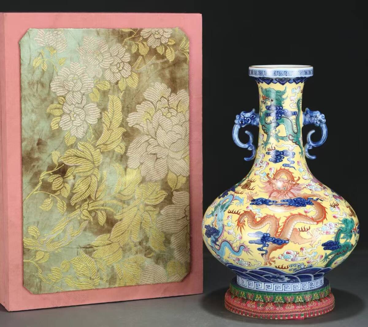 - 磁器 花瓶 秘藏 大清乾隆年制 帝王黄釉粉彩九龍双耳瓶【九五至尊】 官窯 酒器 茶器 唐磁 染付 陶磁器 收蔵品 古美味 時代物古置物 中國文玩