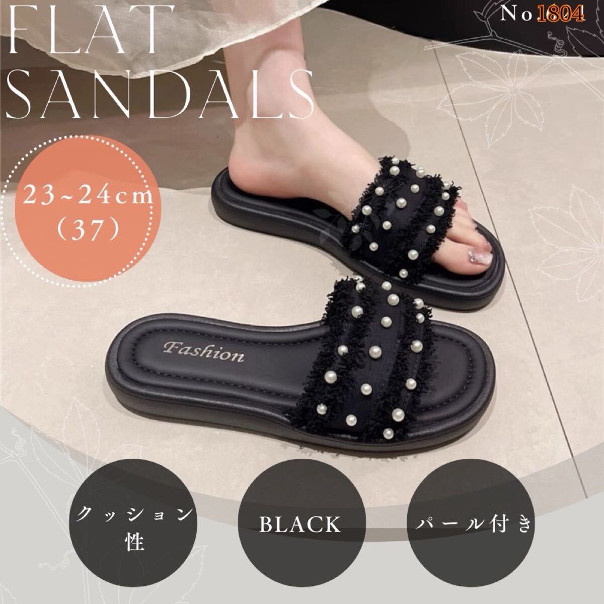 - 新品!パール付き フラットサンダル ブラック 23〜24㎝ フリンジ ぺたんこ 韓国