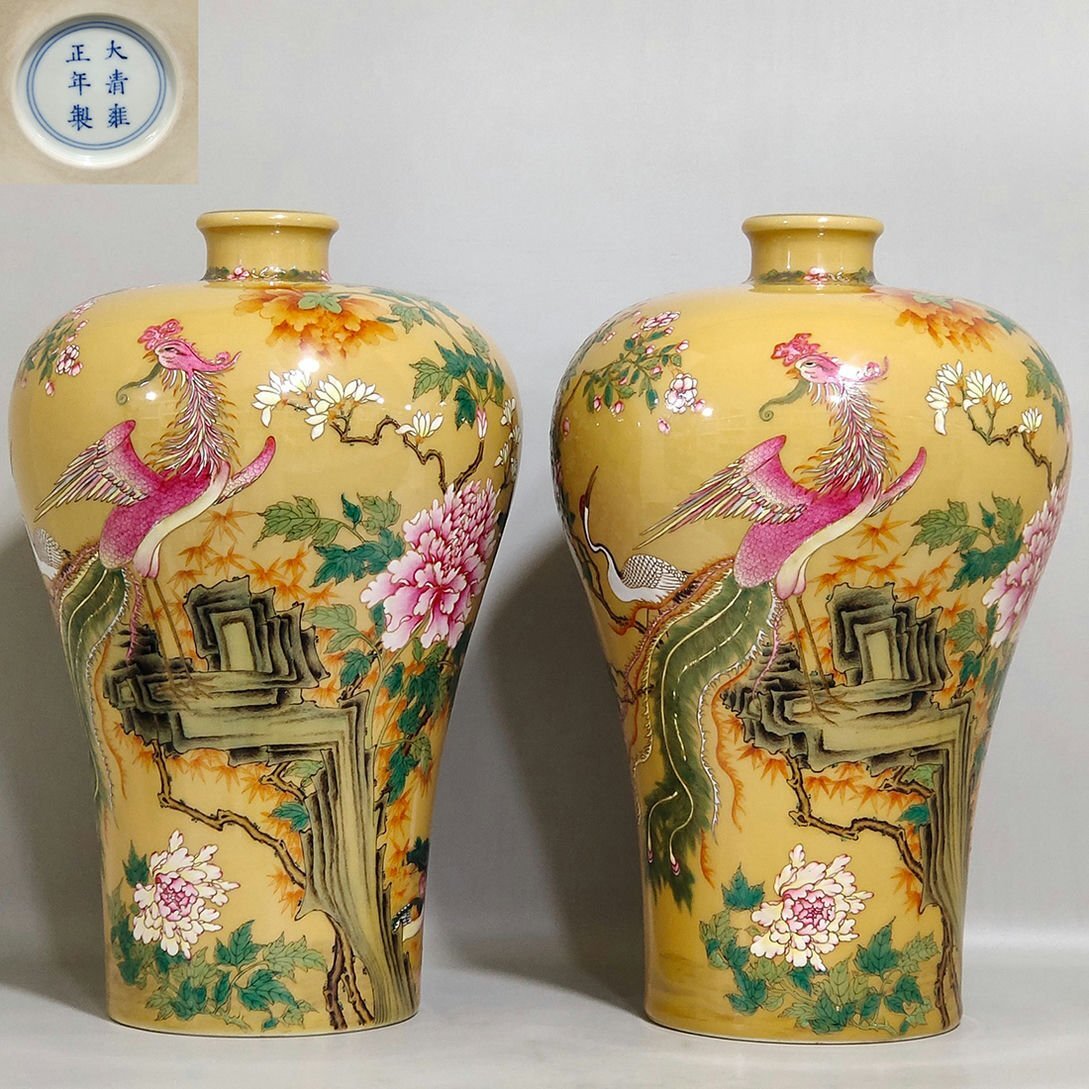 - ▼渡鶴羽▼A2969清時代 雍正年製 粉彩黄釉五倫図梅瓶一対・古陶磁器 ・珍品旧蔵・古賞物・時代物