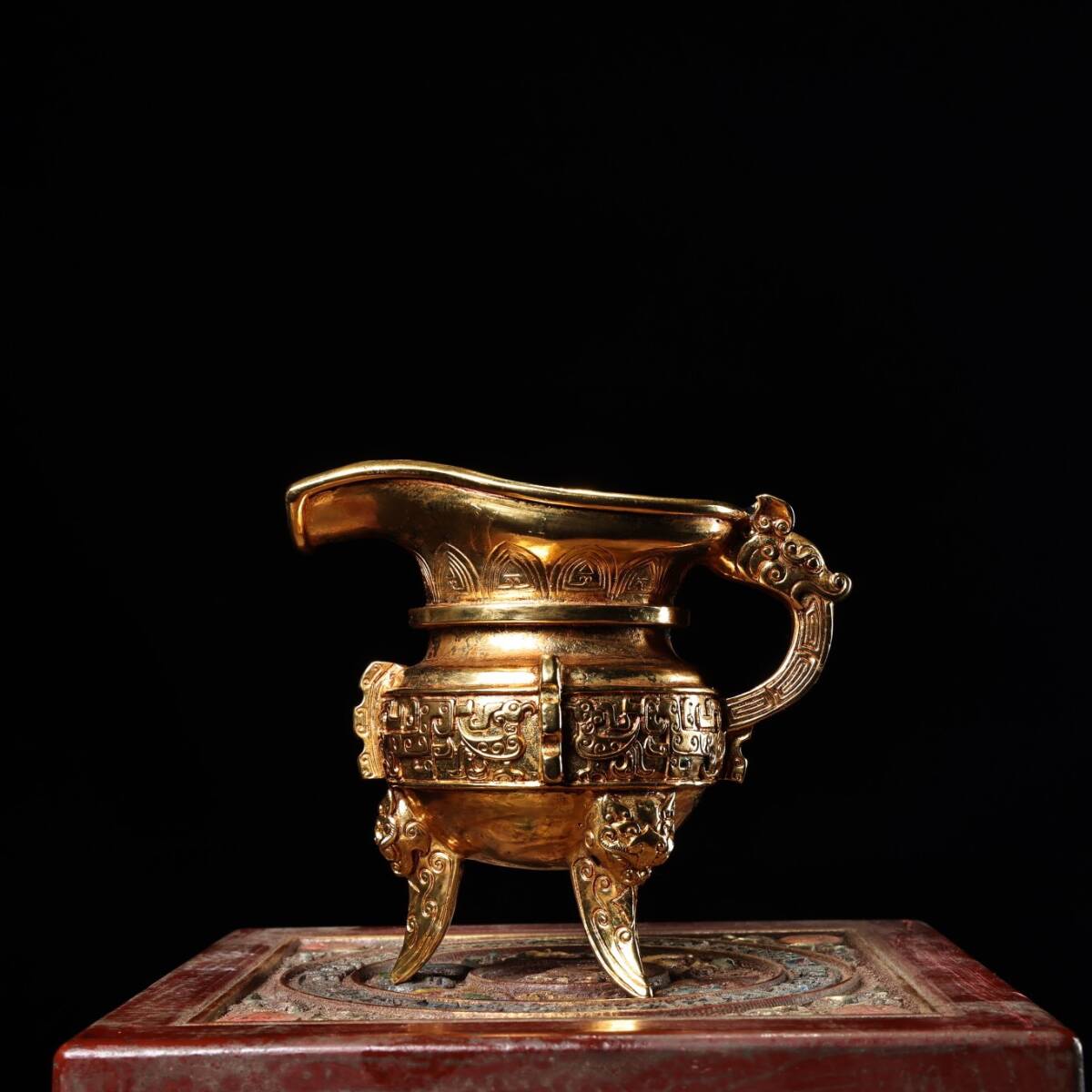 - 【仁】『銅製・塗金・龍把酒杯・箱付・置物・賞物』極細工 古董品 中国古玩 古美術 古美味 時代物 旧家蔵出