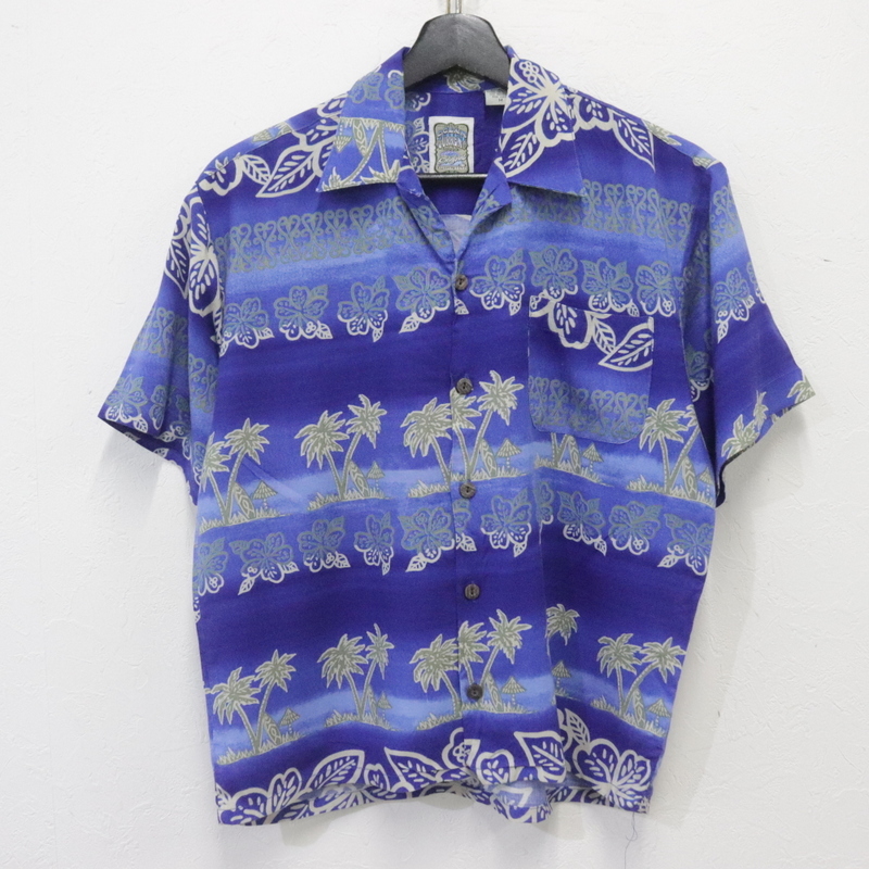 > G742 2000年代製 OCEAN GURRENT 半袖アロハシャツ■00s 表記Mサイズ ブルー レーヨン オープンカラー 開襟 ボーダーパターン アメカジ