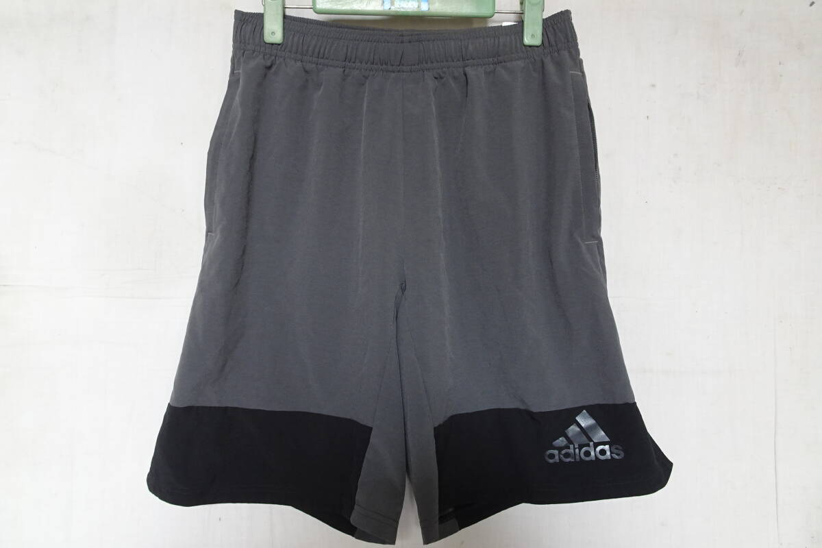 > adidas/アディダス/ショートパンツ/ひざ上丈/速乾性/裾黒切替配色/左裾ロゴプリント/裾サイドスリット/グレー/Lサイズ(6/27R7)