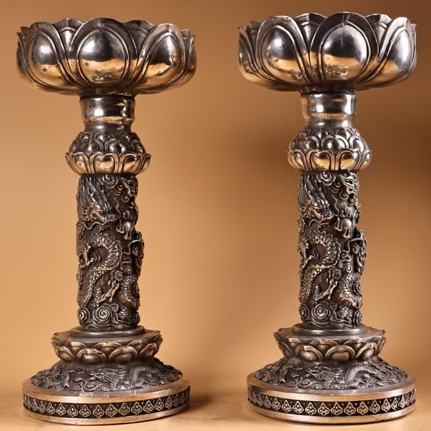 - 大明宣德年制 蝋台 旧蔵 チベット古寺 銅製 古銅 銀 盤龍蝋台のペア 銅琉銀 唐物 收蔵品 時代物 古置物 希少珍品 供養品 文房具 仏教6.26