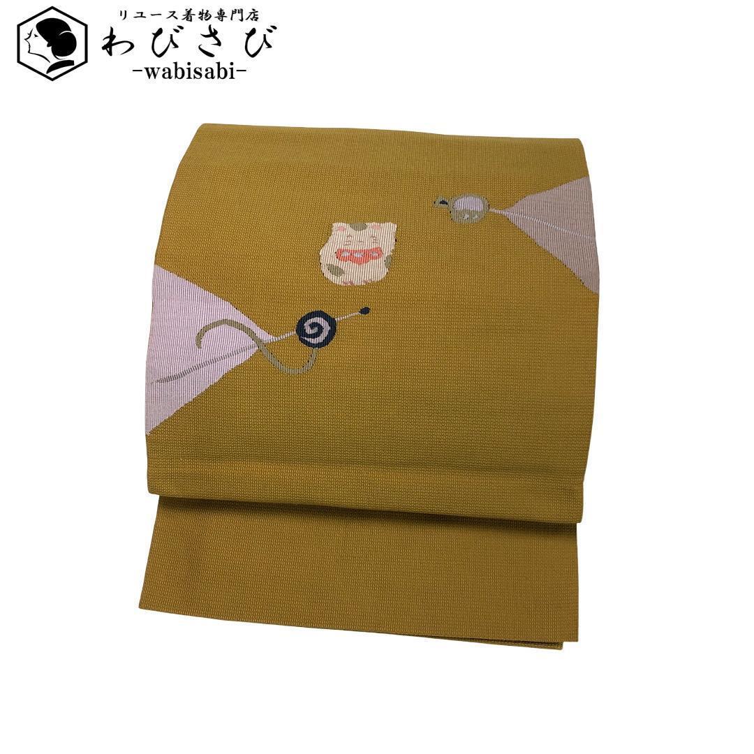 > 名古屋帯 招き猫 かんざし 黄土色 O-5256 着物 きもの kimono 和服 和装 中古 リサイクル着物 【送料無料】