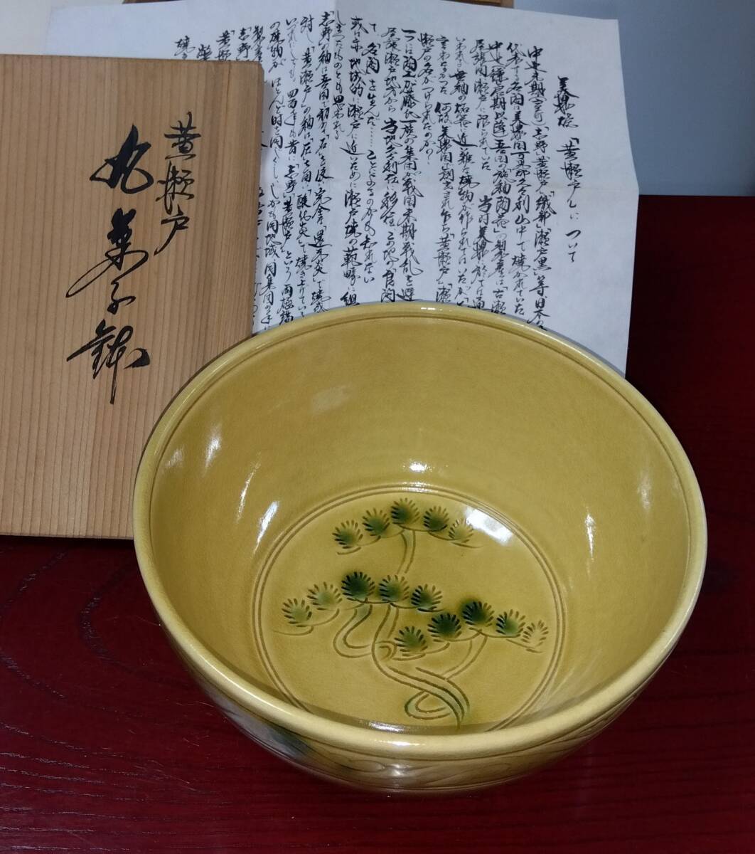 - 美濃焼の名工 佐藤公一郎 康元窯 黄瀬戸線刻吉祥青松紋様中鉢