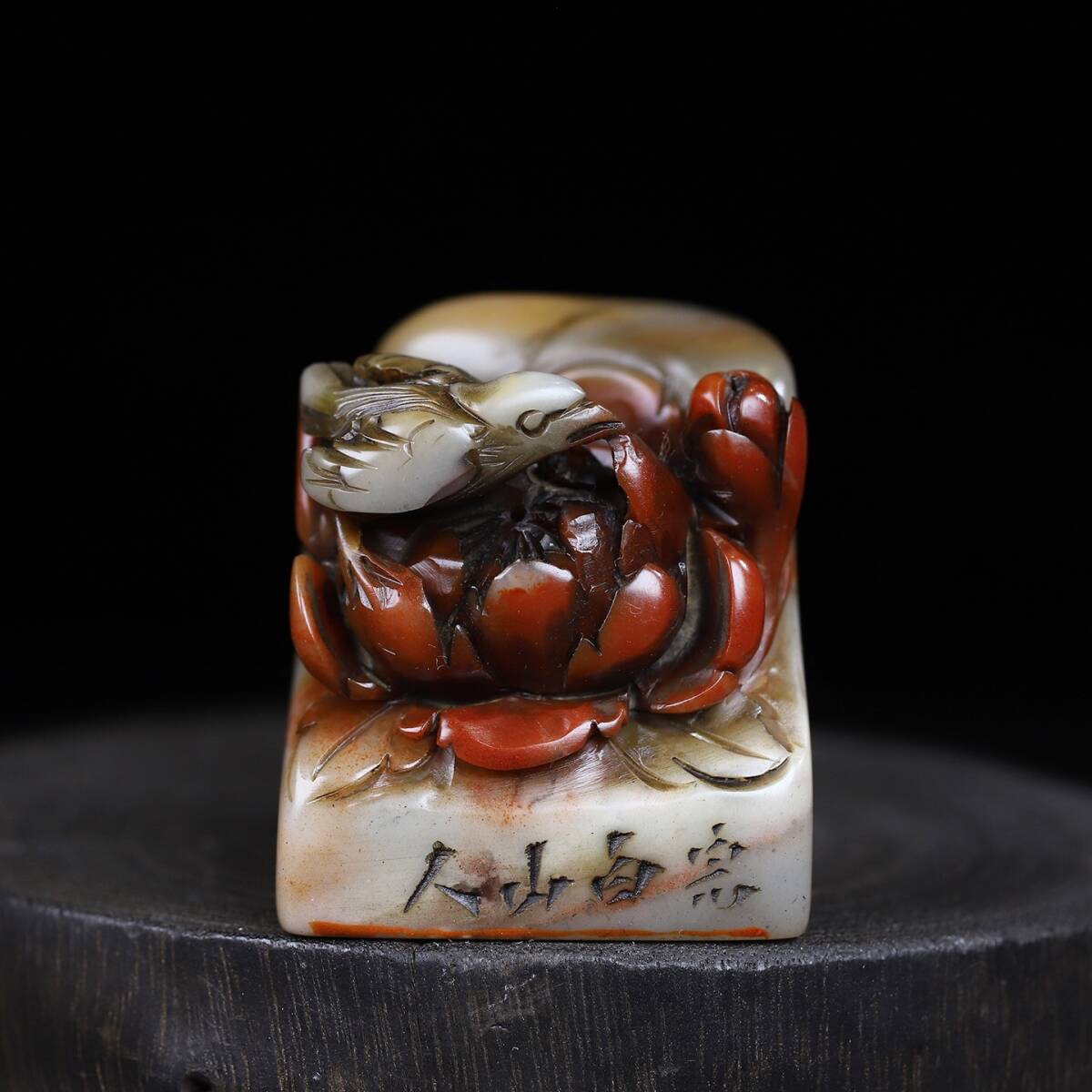 - 『館蔵珍品 寿山石 芙蓉石 細密彫 鳥語花香印章 印章 印鑒』文房具 書道品 貴重物品 収蔵品 中国古美術 時代物 古董品