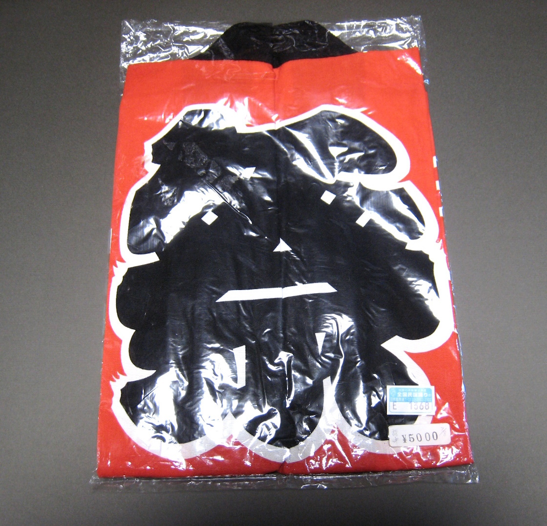 - 法被 子供用 赤色 未使用保存品 身丈57cm 腰ひも 祭り ハッピ 8~9歳 太鼓柄 日本製 綿100%