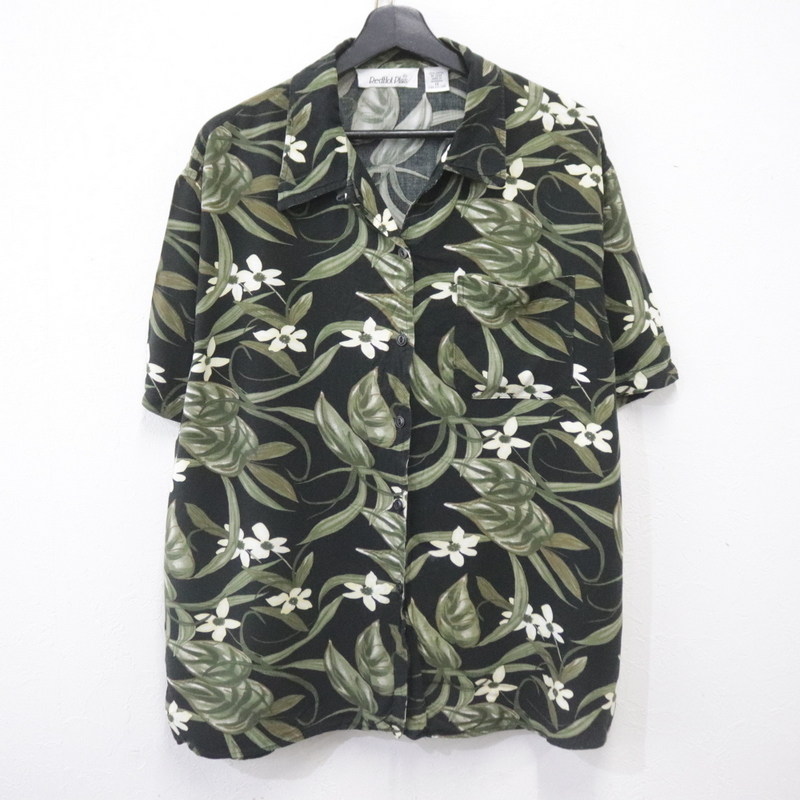 - H602 90sビンテージ RodHotPlas 半袖アロハシャツ■1990年代製 表記XLサイズ レディース ブラック 黒 レーヨン オープンカラー 開襟 古着卸