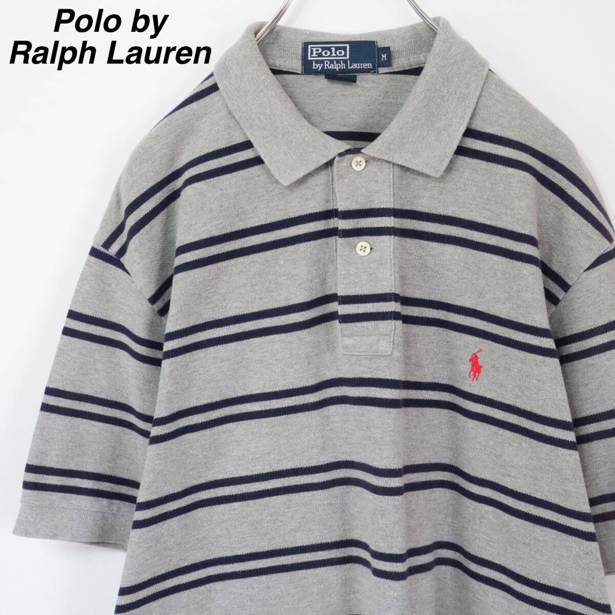 - 【短丈】ポロバイラルフローレン ポロシャツ 刺繍ロゴ グレイ×紺 鹿の子 M