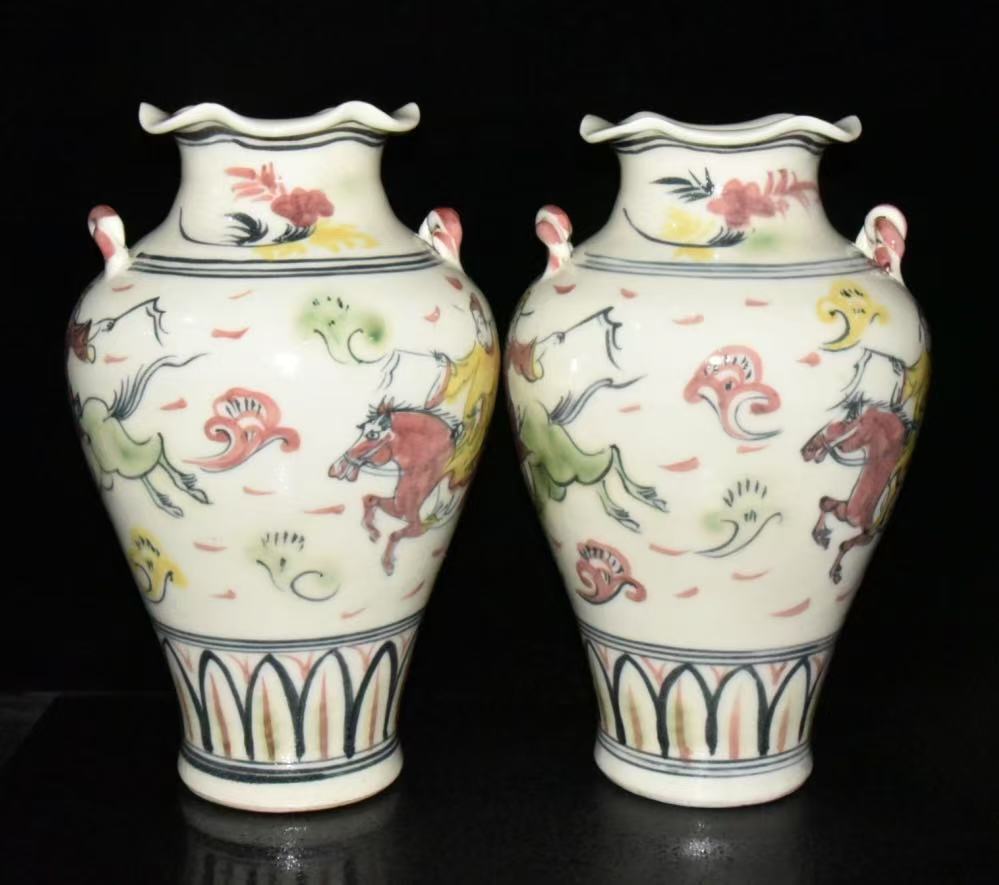 - 磁器 花瓶 秘藏 唐代 の五彩人物物語花口梅瓶のペア 酒器 茶器 唐磁 染付 陶磁器 收蔵品 古美味 時代物 古美術 古置物 珍品 中國文玩6.23