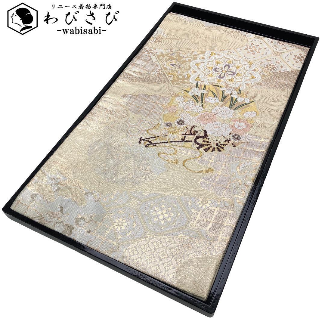 > 袋帯 雪輪 地紙 華柄模様 花車 生成色 金銀糸 O-5175 着物 きもの kimono 和服 和装 中古 リサイクル着物 【送料無料】