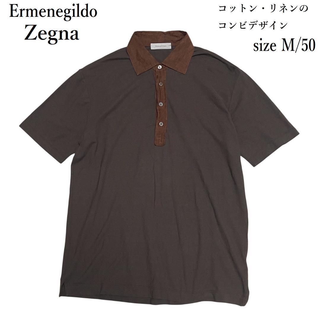 - 【美品】ZEGNA ゼニア ポロシャツ M L 50 コットン リネン 麻 コンビ ブラウン 茶 ダークブラウン 焦げ茶 Ermenegildo Zegna