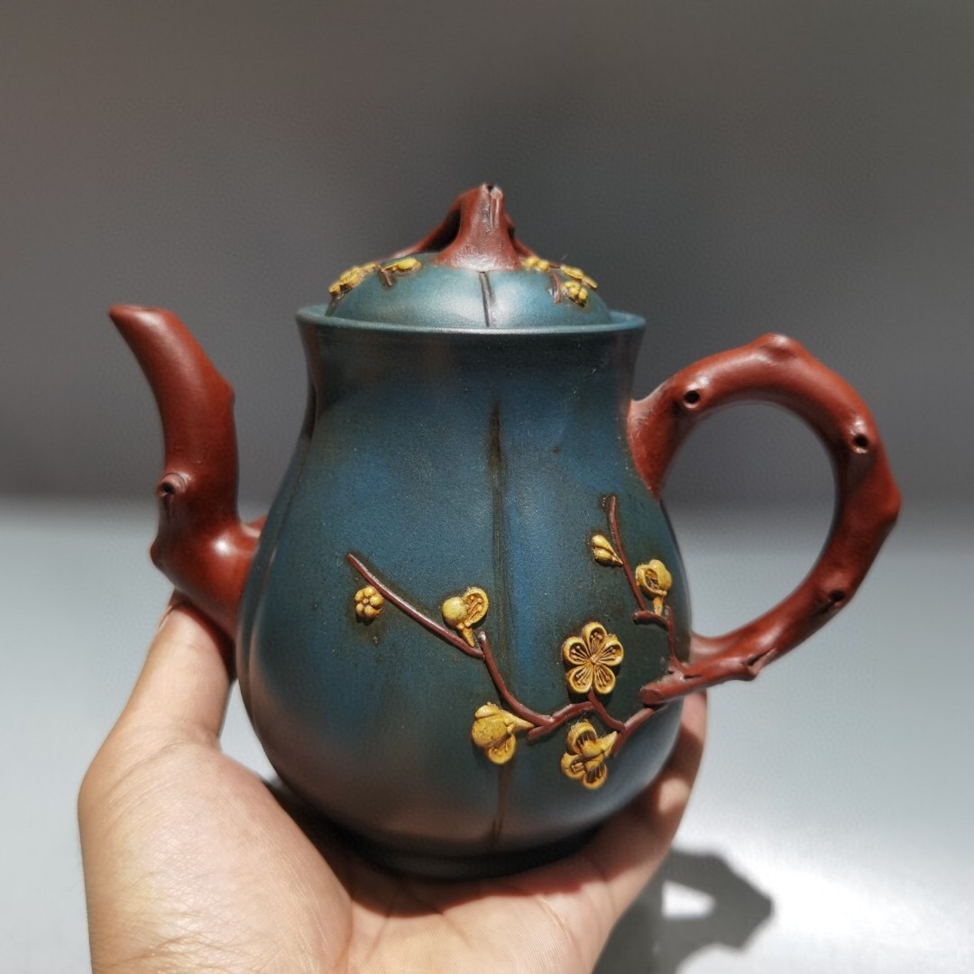 - 蔵友旧蔵出 紫砂壺 三色梅花壺 金鼎商標款 原礦民国綠 茶道品 煎茶道具 文房賞物 希少珍品 中国古玩 中国古美術品
