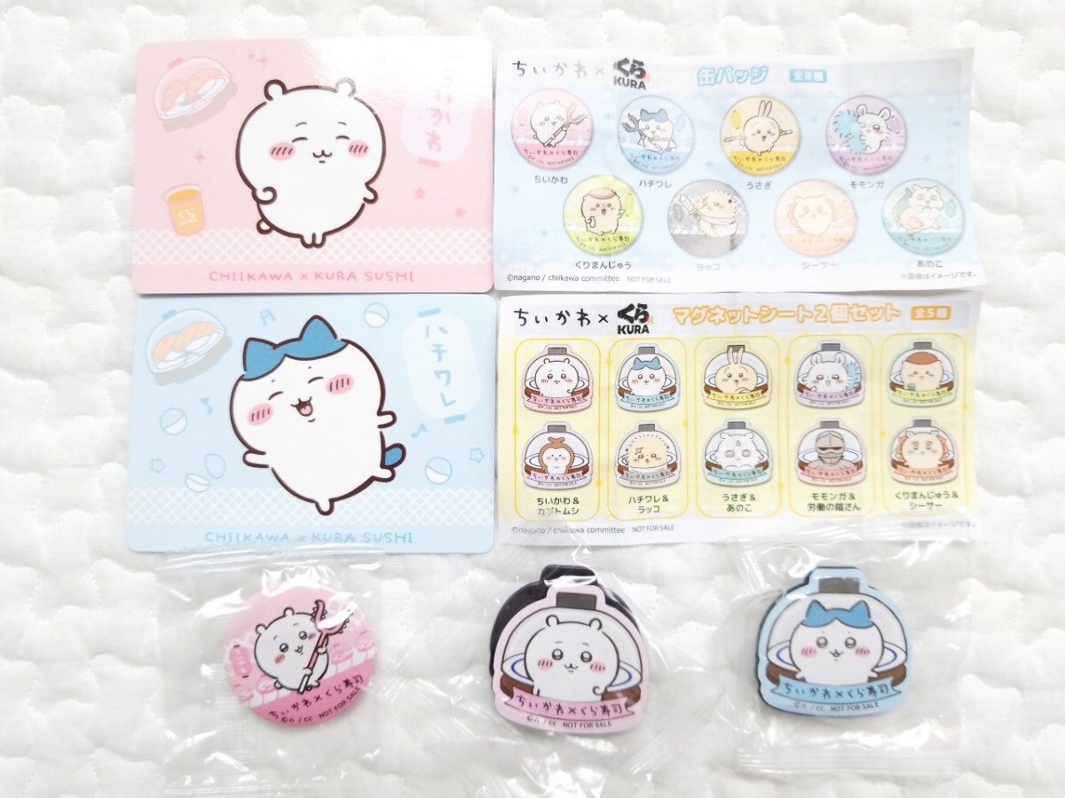 - ☆新品未開封くら寿司×ちいかわコラボ缶バッジ/マグネットシート/カード/ちいかわカブトムシハチワレラッコ合計5点セット非売品レア希少☆