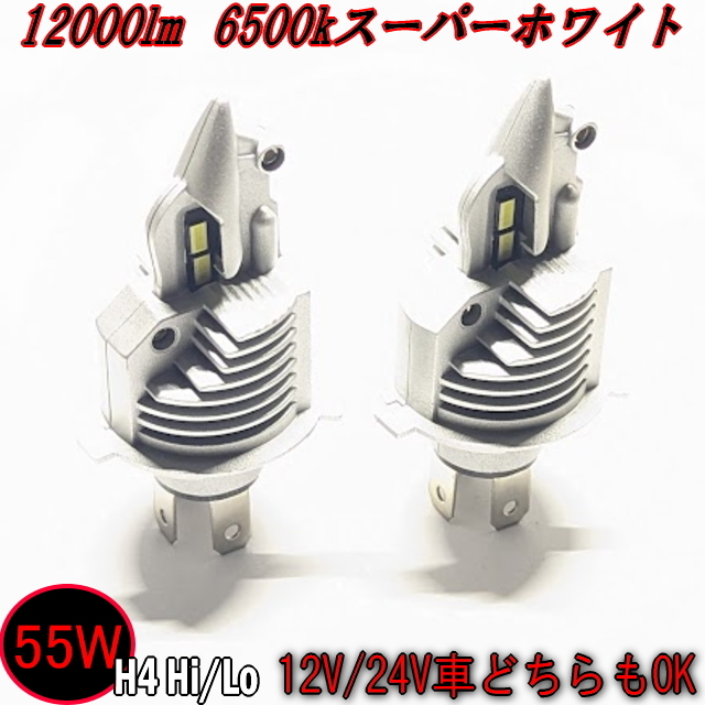 - ポン付け防水キャップの加工なし純正交換タイプ 爆光LEDヘッドライト12000lm H4 Hi/Lo 6500k SPホワイト光 55w 12V/24V両用 カットラインOK